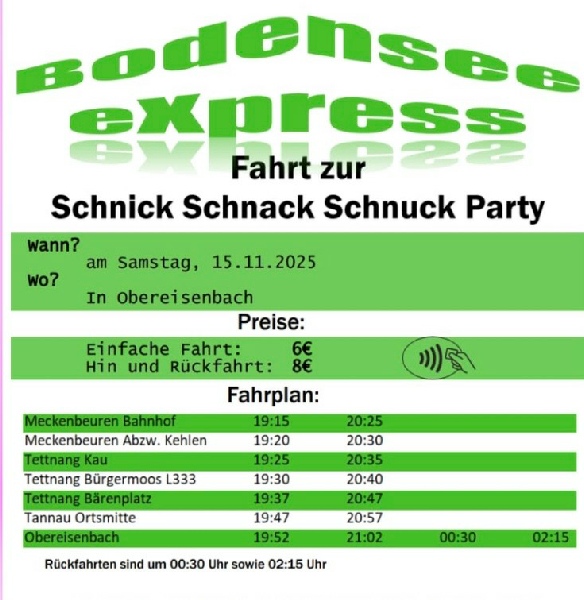 Abfahrt mit dem Reisebus in Obereisenbach um 14.00 Uhr und Rückkehr gegen 21:30Uhr.